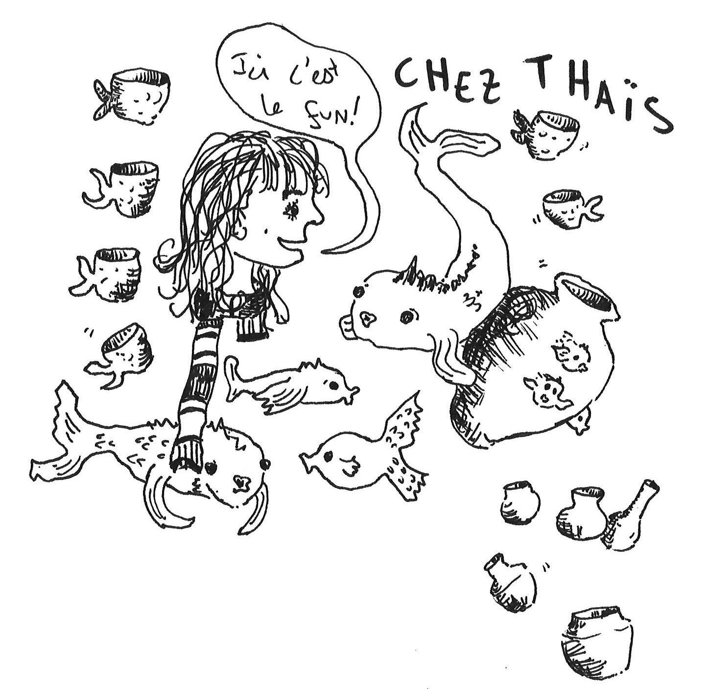 La technique de prédilection de Thaïs est le modelage, bien qu’elle apprécie également tourner. Depuis quelques années elle a un penchant très marqué pour les poissons, fil rouge qui unifie sa production. Elle crée avec une grande spontanéité, au gré de ses envies. Il lui arrive de prendre des commandes si celles-ci lui parlent. Elle produit principalement des pièces utilitaires: des patères, des tasses, des bougeoirs, des petites boîtes, des poignées de meubles, etc.