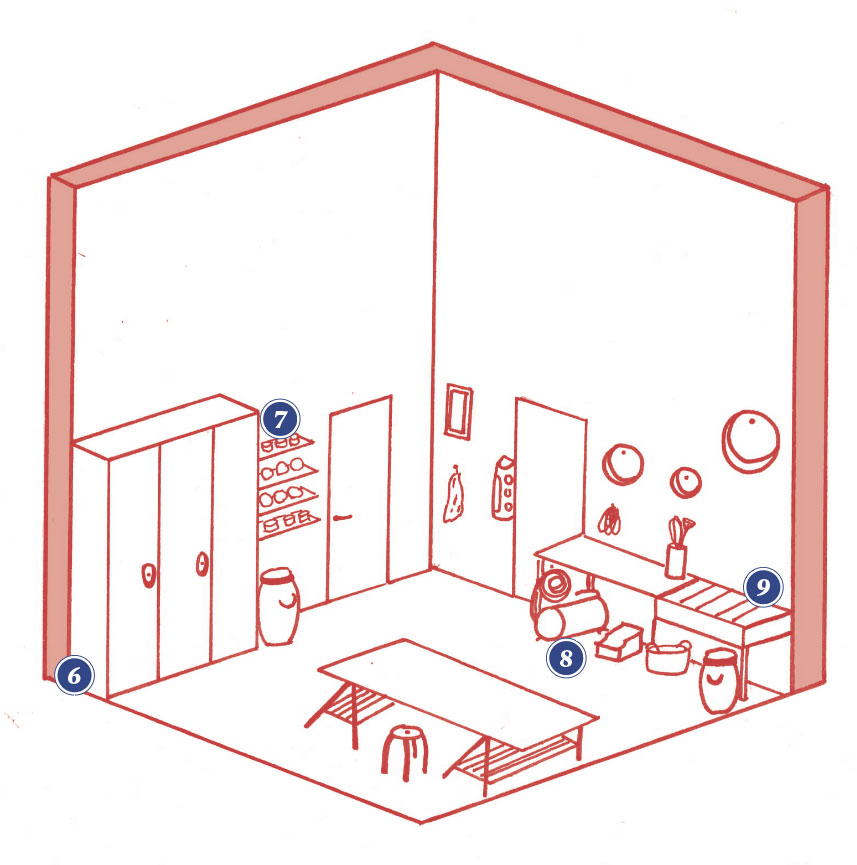 L’atelier est divisé en deux espaces. En entrant, on arrive où se trouvent le four, le lavabo, une table de coulage, l’armoire des matières premières et une grande table de travail. Cet espace est dédié à la terre.