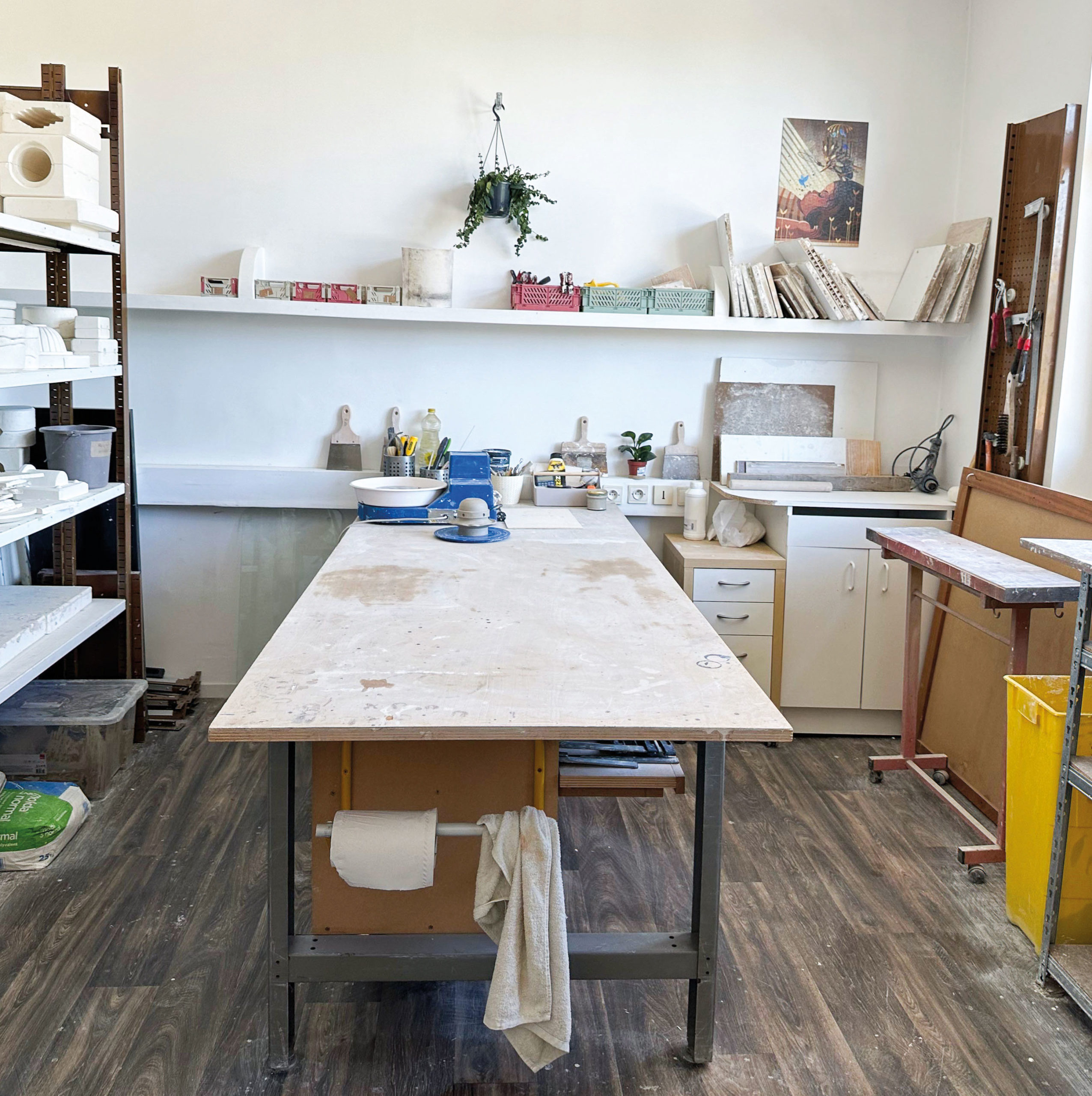 Sur la gauche se trouve le second espace, réservé au travail du plâtre. Il y a un bureau, l’étuve, les moules et une très grande table de travail. Cet espace permet de faire du moulage et d’accueillir les stagiaires.
